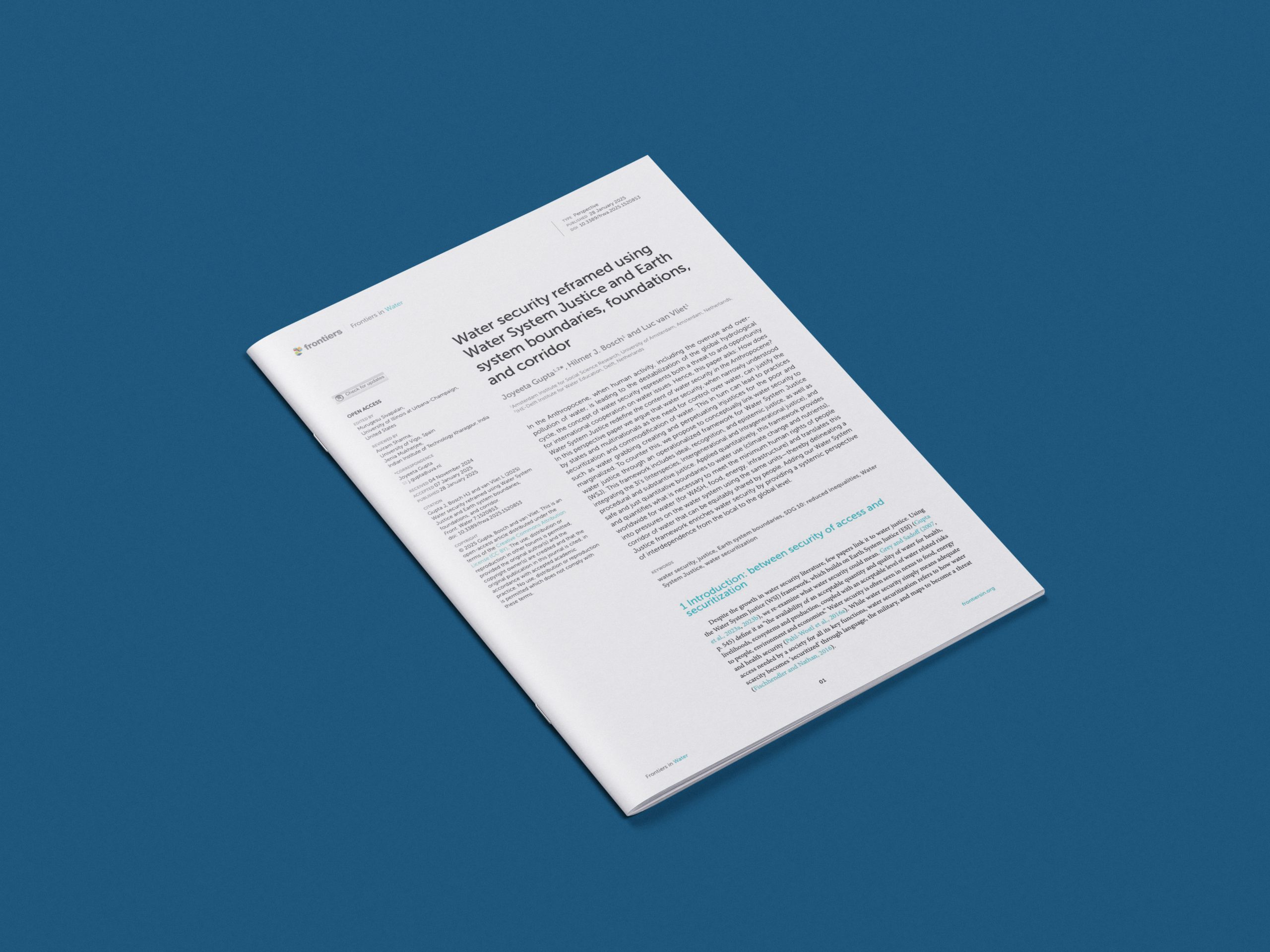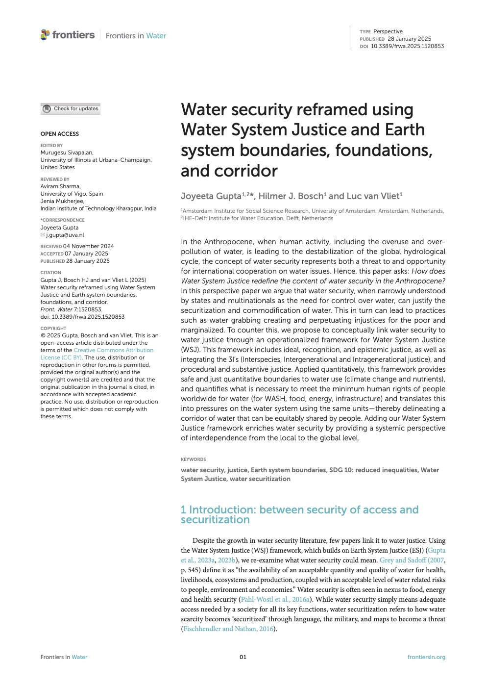 In the Anthropocene, when human activity, including the overuse and over-pollution of water, is leading to the destabilization of the global hydrological cycle, the concept of water security represents both a threat to and opportunity for international cooperation on water issues. Hence, this paper asks: How does Water System Justice redefine the content of water security in the Anthropocene? In this perspective paper we argue that water security, when narrowly understood by states and multinationals as the need for control over water, can justify the securitization and commodification of water. This in turn can lead to practices such as water grabbing creating and perpetuating injustices for the poor and marginalized. To counter this, we propose to conceptually link water security to water justice through an operationalized framework for Water System Justice (WSJ). This framework includes ideal, recognition, and epistemic justice, as well as integrating the 3I’s (Interspecies, Intergenerational and Intragenerational justice), and procedural and substantive justice. Applied quantitatively, this framework provides safe and just quantitative boundaries to water use (climate change and nutrients), and quantifies what is necessary to meet the minimum human rights of people worldwide for water (for WASH, food, energy, infrastructure) and translates this into pressures on the water system using the same units—thereby delineating a corridor of water that can be equitably shared by people. Adding our Water System Justice framework enriches water security by providing a systemic perspective of interdependence from the local to the global level.